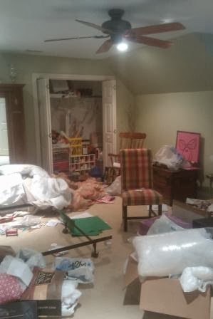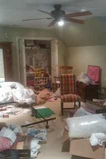 In September, I held a shoes, clothes and purse sale. I had over 200 pairs of shoes, 60-70 purses and other items that I was selling for my clients, . In October I had to get ready to go to a festival to sell some products I was promoting. In November and December, along with working during the week in my de-clutter business, I worked, on the weekends at a kiosk we had in a mall that was located out of town. All of this goes with trying to keep up with some semblance of house cleaning, washing clothes, cooking, and trying to be a good wife, mother, friend and oh, yeah, Christmas decorating and Christmas shopping. So, here is the result; too many things being thrown into two rooms and neglected, for a period of time.