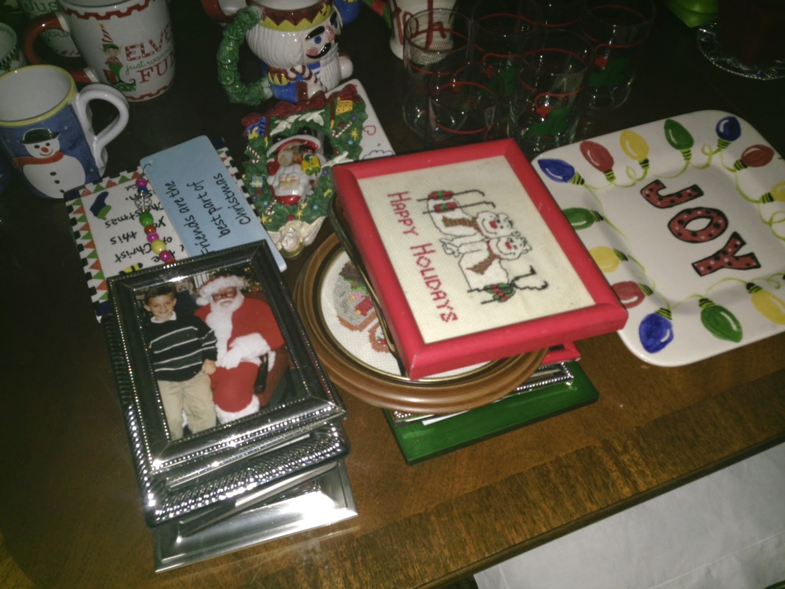 You can see, from the pictures below, the “like” items I have: Santas/decorative items, stockings/pillows/tree skirt, Nativity sets, framed Christmas photos and plaques, dishes, books, window lamps, window greenery, bows and outdoor spotlights and cords.