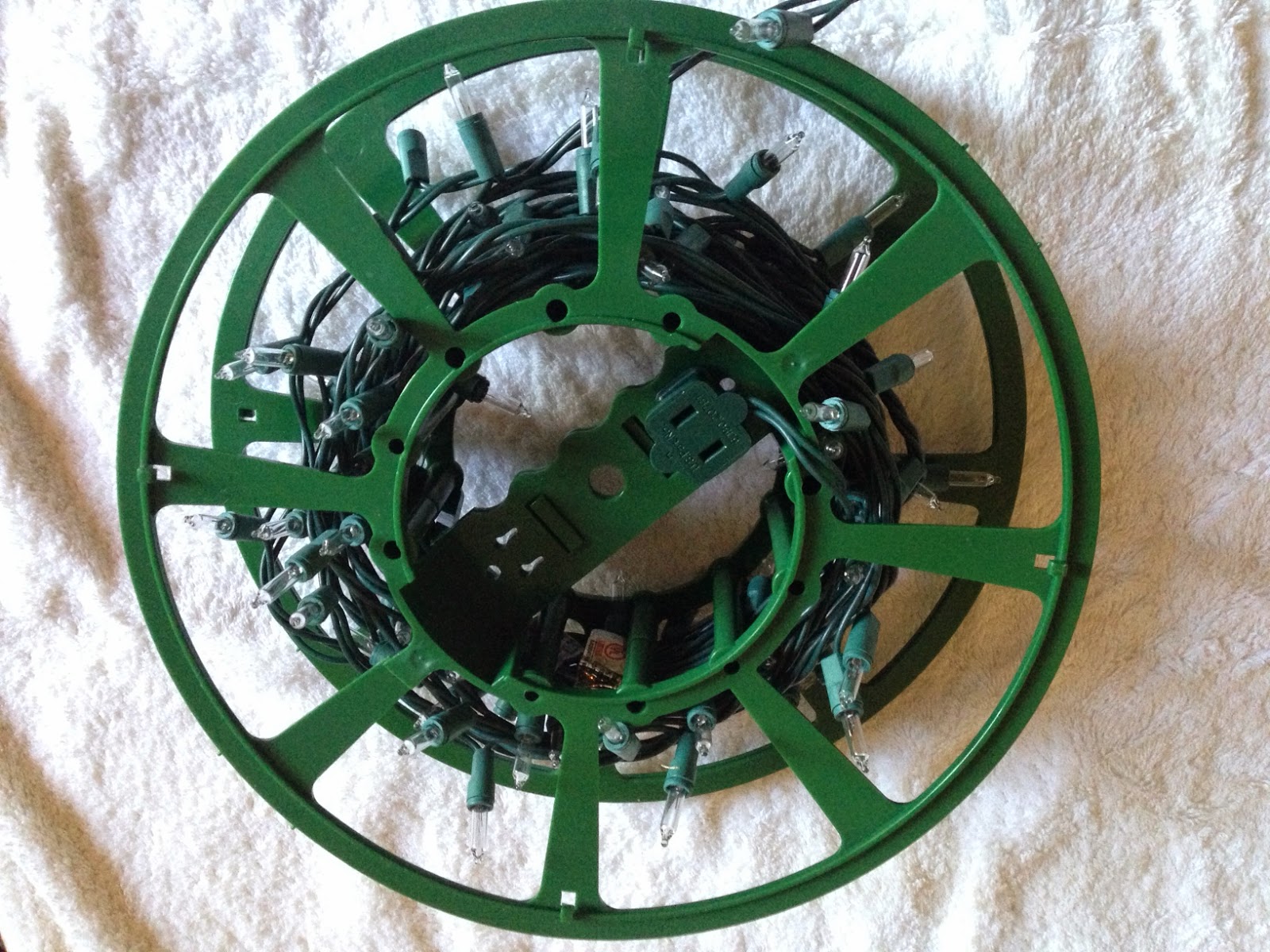 Each wheel holds 2-3 light strands. They then fit nicely into their handy, dandy carrying case. On top of the wheels, I place the cord that houses the “on/off” button for the lights.