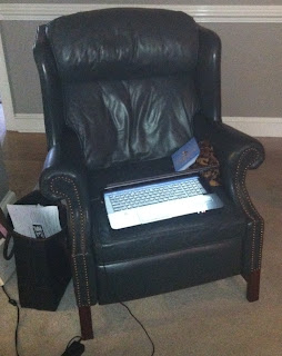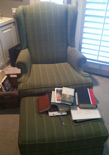 How does that apply to adult life? In my den, I have 2 centers that just happen to look like chairs. If you look in the photo below you will see a chair with a lot of books. This is the “reading” “life coaching” and “quiet time” chair. In the basket, to the left of the chair, you will find books I am reading,some of my life coaching reference books and information, my Bible and devotional books. I keep a highlighter and pen handy for marking up and making notes about things I want to remember.
